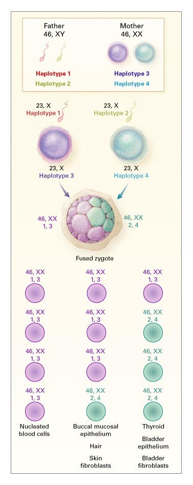 2002年,以为美国女性Lydia Fairchild被剥夺了公共援助,因为DNA检测表明,她不是自己女儿母亲的。后来的研究表明,Lydia Fairchild的确是自己女儿的亲生母亲,只不过她的生殖细胞来源于同胞异卵姐妹嵌合体。
