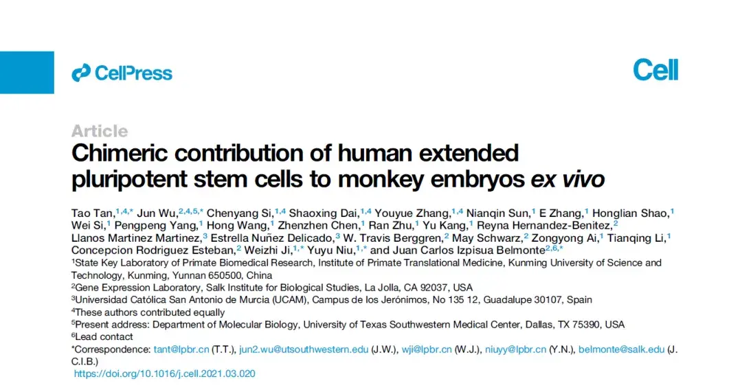 论文原文:Chimeric contribution of human extended pluripotent stem cells to monkey embryos ex vivo