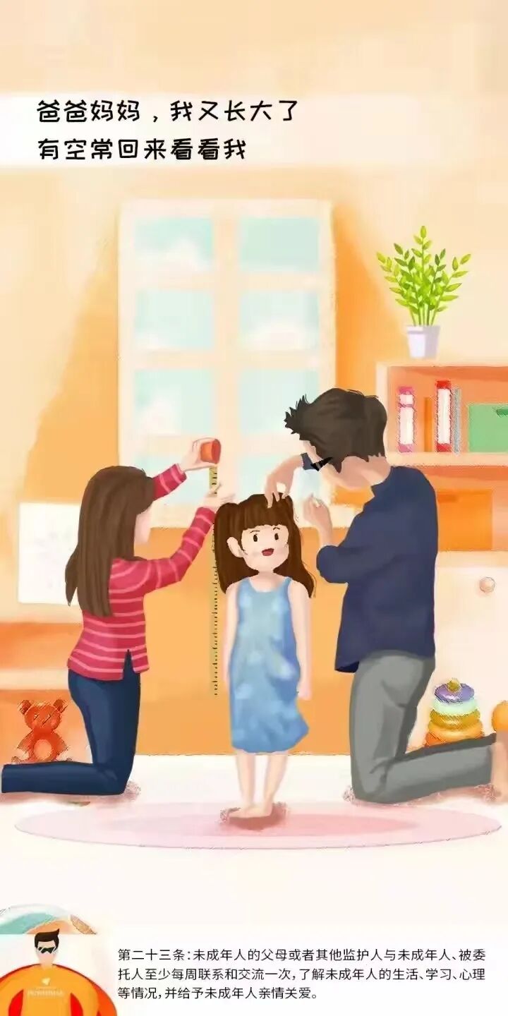 二、未成年人的成长,需要父母的言传身教。父母是孩子的第一任教师,家庭是保护孩子的第一道防线。希望广大家长朋友,认真学习贯彻《中华人民共和国未成年人保护法》,注重家庭、注重家教、注重家风,用正确的思想、高尚的人格、良好的言行为孩子作表率,扣好人生的“第一粒扣子”。