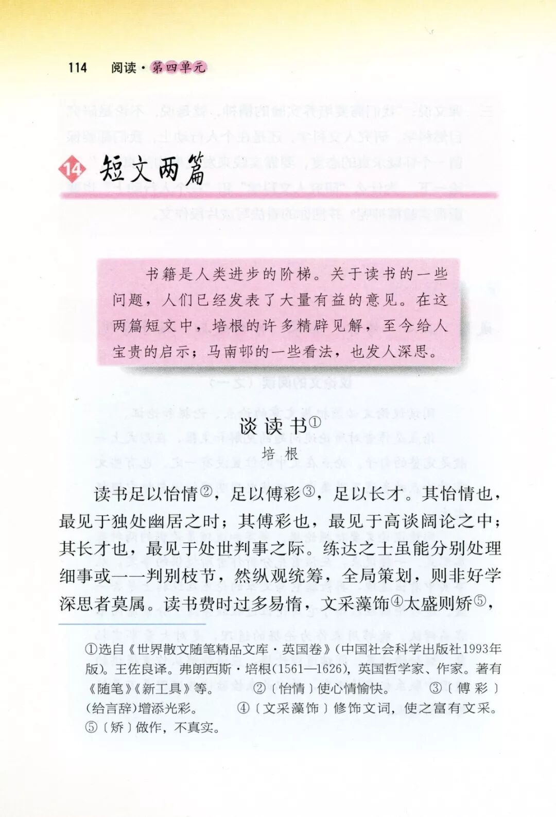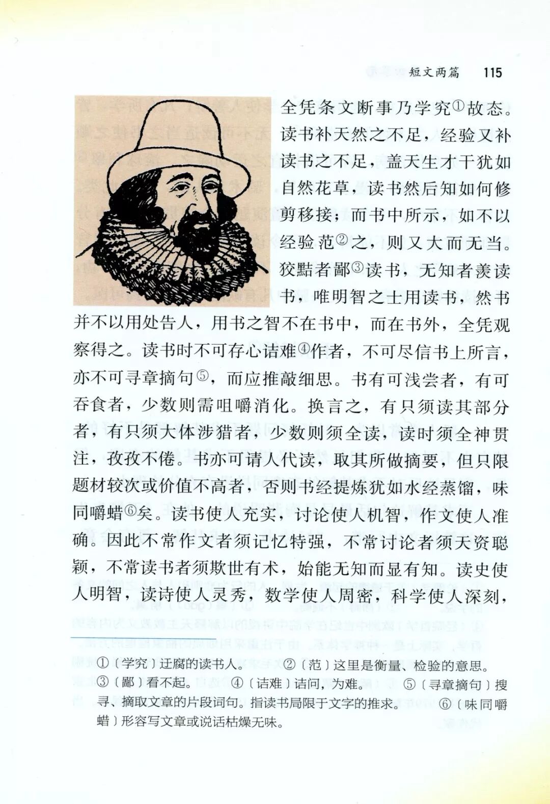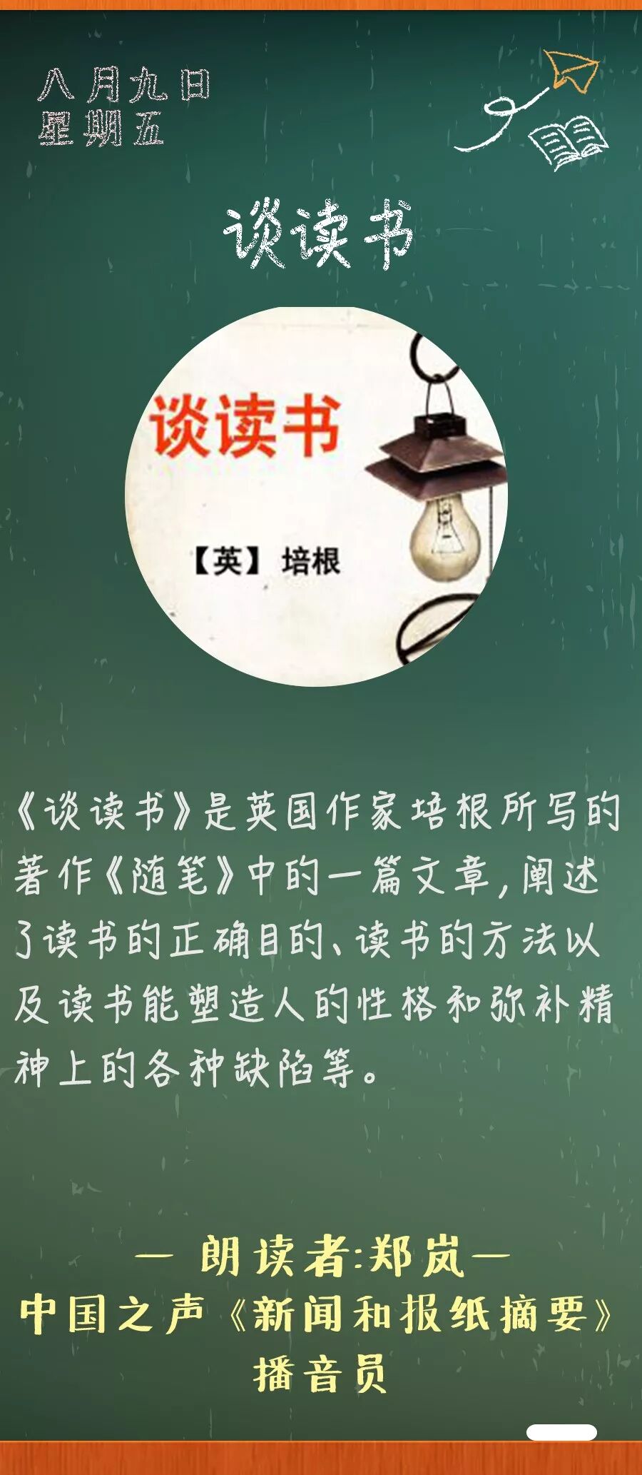 《谈读书》是英国作家培根所写的著作《随笔》中的一篇文章。《随笔》是培根在文学方面的主要著作,初版于1597年,只包含10篇极短的摘记式文章;经过1612年和1625年两次增补扩充,才收入了短文58篇。然而它在英国文学史上却有重要地位。培根是一个通晓人情世故的哲学家和政治活动家,他在书中写了对世家子弟的“社会的与道德的劝言”(这是书的副标题),内容涉及哲学思想(如《真理》《死亡》),伦理探讨(如《忌》《爱》《利己的聪明》),做官秘诀(如《高位》《党争》),处世之道(如《友谊》《诡诈》),治家准则(如《父母与子女》《婚嫁与单身》)等,还包括了对若干具体问题的建议(如《读书》《旅行》《营造》《娱乐》),也不乏对艺术和大自然的欣赏(如《美》《庭园》)。