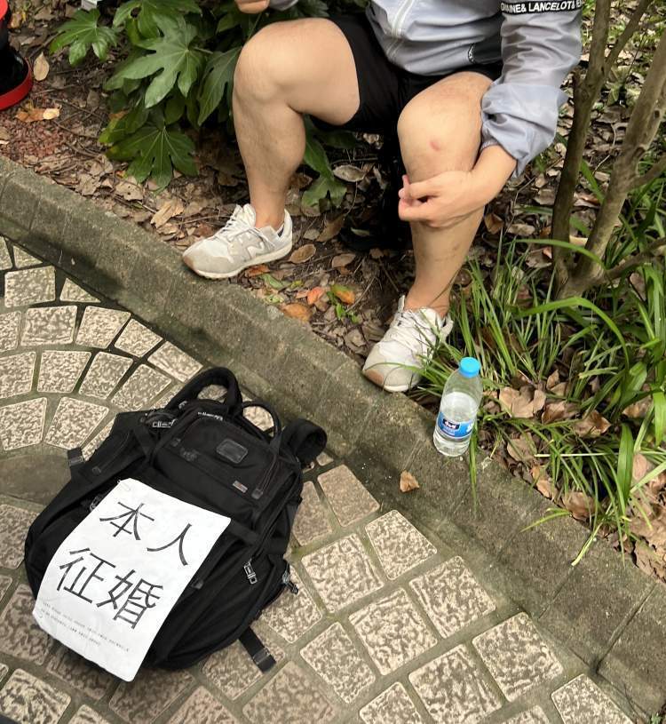 除了曹再飞,人民公园相亲角还有不少“奇人”,让我们印象最深刻的是一个叫李然(化名)的年轻人。在树荫下的小路上,李然慵懒地坐在石墩上,不同于身旁四处张望、白发苍苍的老人,李然拿着手机玩游戏、刷短视频,身前的纸上写着“本人相亲”的字样,这一切都显得与相亲角格格不入,“我就是来看看,有合适的就聊聊。”面对我们的疑问,他只是瞥了一眼,便转头“钻进”手机里去了。