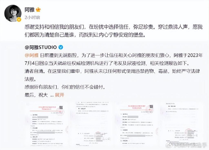 大小S被黄子佼爆料说吸毒嗑药后,她们都没出来回应,倒是阿雅晒出了自己的毛发和尿液检测证明,力证自己清白。