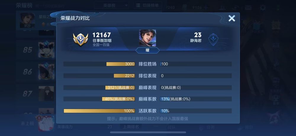 巅峰赛系数在45%左右,曜的巅峰分在3100左右,排位表现分在2200分左右。
