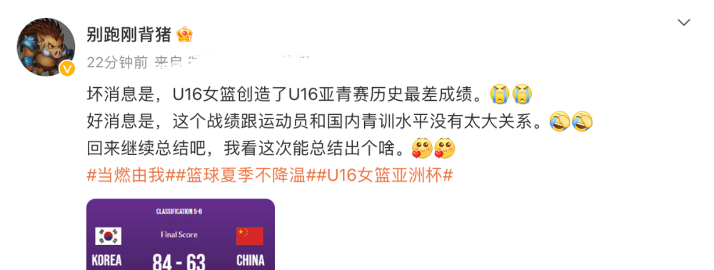 北京时间7月16日,U16女篮亚锦赛,中国队迎来排位赛对手韩国,最终以63-84负于韩国队,收获赛事第六名的成绩,本届赛事打完中国队仅1胜3负,成绩惨淡。