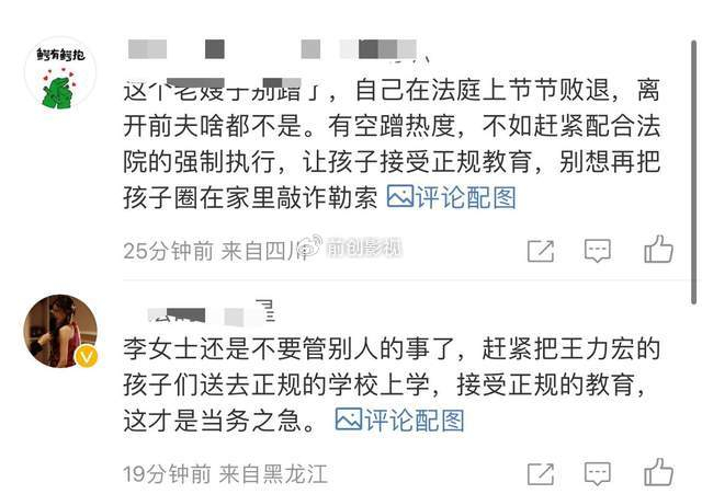 还有网友说到“这个老嫂子别蹭了,自己在法庭上节节败退,离开前夫啥也不是。有空蹭热度,不如配合法院强制执行,让孩子接受正规教育,别想再把孩子圈在家里敲诈勒索。”