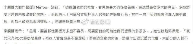 而郭源元此前说过一句话“我们都希望烂人踢到铁板,但是谁都不想成为这块铁板。”对此李靓蕾表示“要当那块铁板有多不容易,需要面对的可能比我们想象的要多得多。”