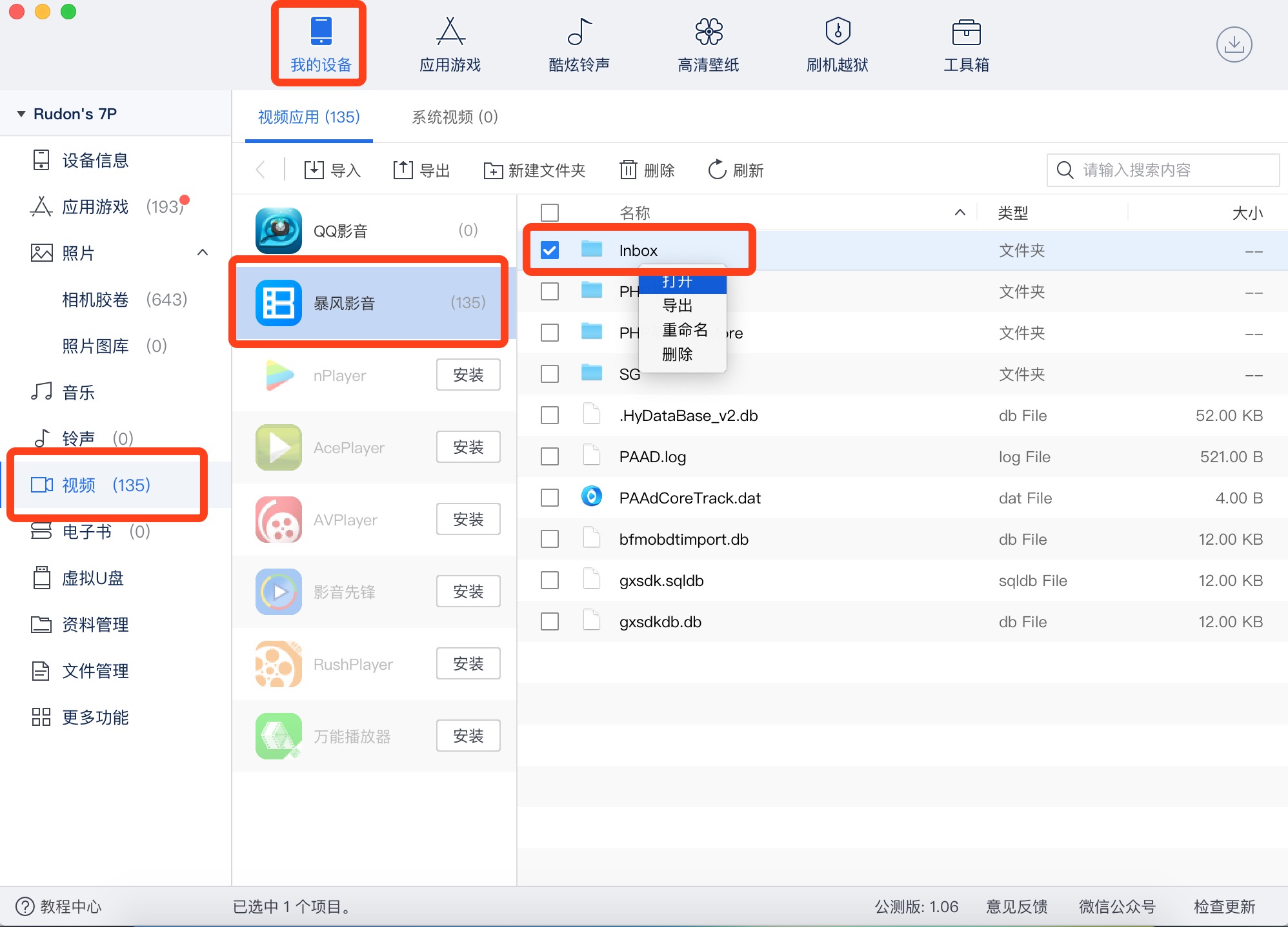电脑装好爱思助手手机装好暴风影音iPhone打开“百度网盘”,播放已经下好的视频,然后暂停一下找到“删除”按钮左边的“隔空投递”按钮,点击(注意:不是分享按钮)选择“拷贝到暴风影音”,然后手机会开始复制,期间手机完全没有进度提示,请别动,大概等候2分钟,复制完毕,会自动弹出“暴风影音”界面,可以看到本地视频中已经看到那个文件了手机用数据线连接电脑,打开爱思助手,“我的设备”>左边展开栏"视频">视频应用>暴风影音>打开文件夹“inbox”>找到你的视频文件>右键>导出完成