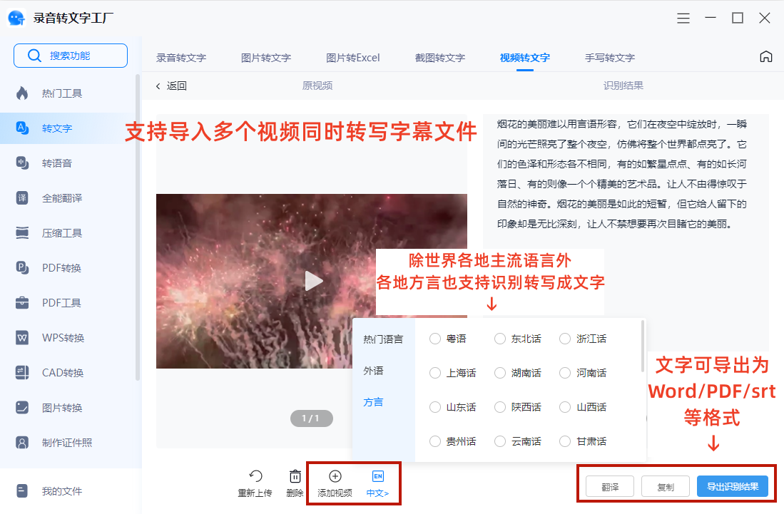 【视频转文字】功能中,除了中/英/日/法等主流语言外,咱粤语/四川/东北等地的方言也能够识别并转写成文字;