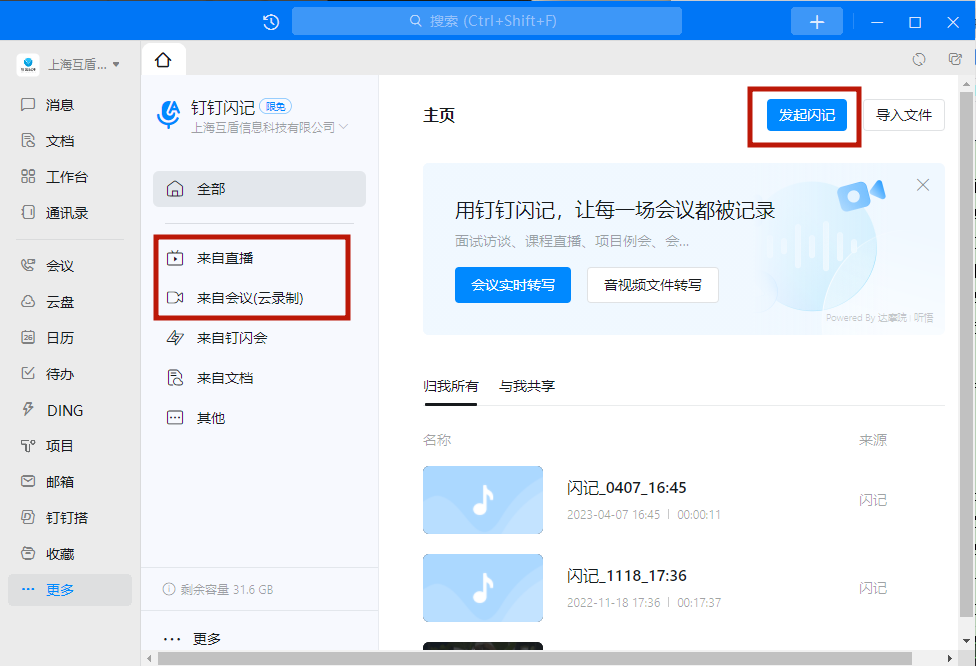 点击“更多—闪记”进入界面,选中“来自直播/会议”,便可实现在电脑上实时转写视频中的文字内容;目前仅支持识别普通话和英文这两种语言,也支持支持导入多个本地的mp3/mp4进行转写。直播视频会在侧边栏显示字幕,本地视频则默认将翻译的文字内容保存为钉钉文档。