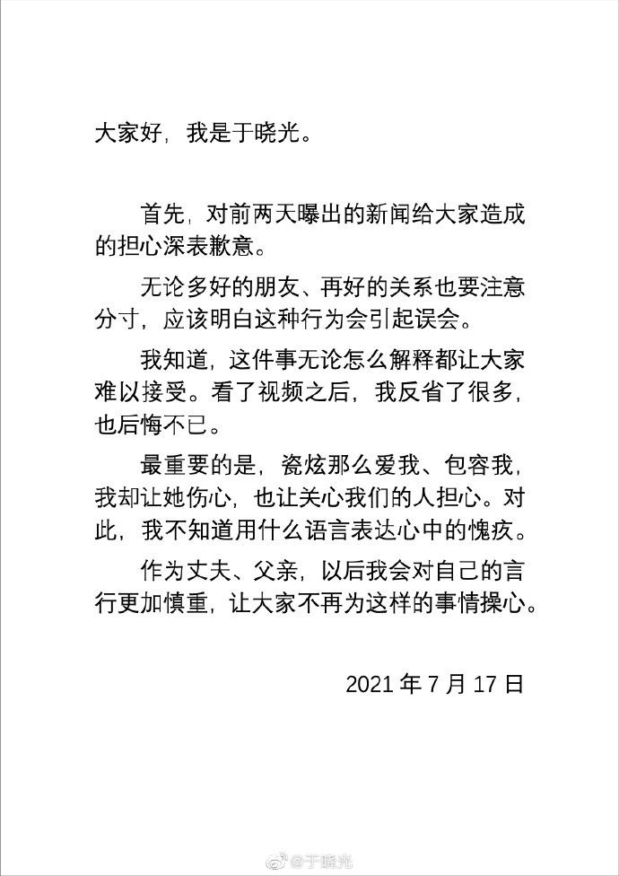 于晓光则称:“这个事情我一开始就知道没事,但是现在的网络自媒体恶意剪辑。我们本来准备用另一种方式解释,但很多人不相信,更愿意相信一个人形象崩塌,更关心这种东西。所以当时我们觉得,时间会证明一切。从我的角度来讲的话,我最对不起的是我的太太。”