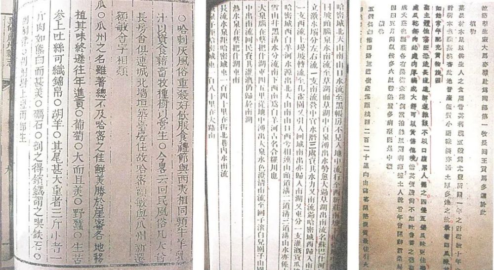史料有关哈密贡瓜的记载。从左至右依次为《重修肃州新志》卷七、《哈密志》《哈密直隶厅乡土志》。来源:《哈密瓜志》