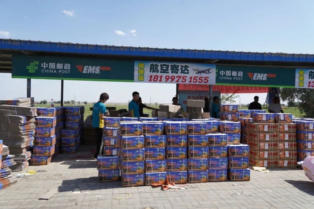南湖乡红山村哈密瓜集中收购点张贴着邮政航空寄达的海报。融媒体中心记者 杨宏建摄