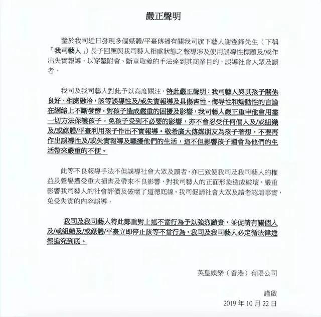 随后,经纪公司发声明否认了传闻的真实性,并强调父子相处融洽,谢霆锋也表示他会用尽一切方法来保护孩子,避免孩子受到不必要的影响。