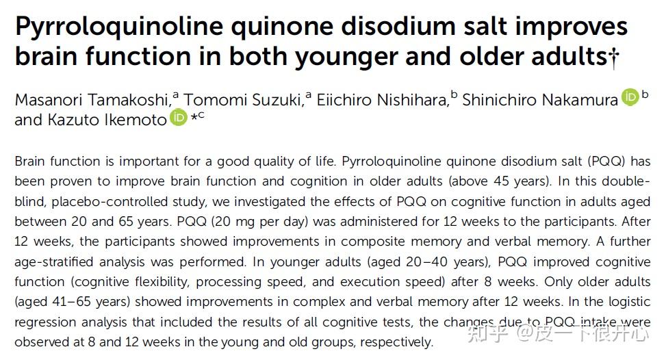 而PQQ神奇的地方在于,它可以靶向作用到细胞中的线粒体,增加线粒体的数量,激发线粒体的活性。相当于我们身体内有更多、更好的发电站,源源不断地为脑细胞补充能量。从而帮助增强记忆力,改善认知功能。今年新发布的一篇关于膳食PQQ可改善年轻人和老年人的大脑功能的研究。实验结果证实:PQQ通过增加神经生长因子(NGF)和NGF受体的表达,改善语言记忆、即时记忆、工作记忆等。