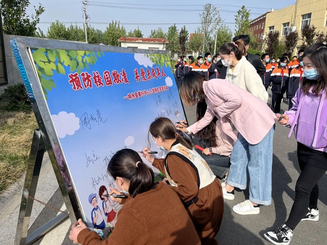 在签名仪式上少先队辅导员就全国发生的校园欺凌现象,分析了校园欺凌的本质特征和危害,号召学生要树立积极进取,乐观向上的人生观,勇于向欺凌现象说不。