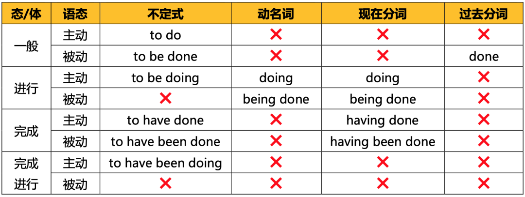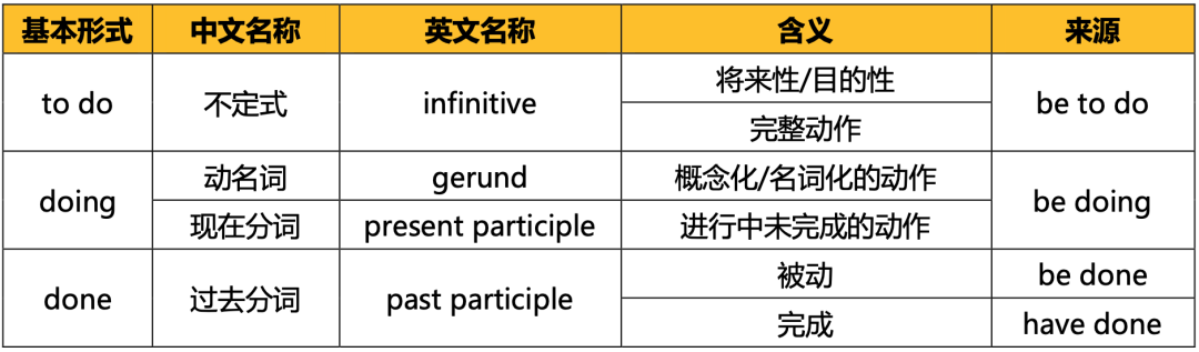 非谓语动词除了to do、doing和done三种基本形式,还有根据(时)态(现代语法称为体aspect)和语态变化的扩展形式,如下表。从功能而言,所有扩展形式理论上都可以像基本形式一样做谓语动词之外的所有语法成分,但是在实际语言使用中,由于语义上不需要,所以部分形式并不会做某些语法成分。
