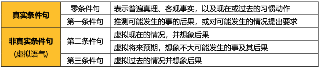 英语中的条件状语从句根据条件的真实性、假设性等分为四种,分别称为零条件句、第一条件句、第二条件句、第三条件句,前两种是真实条件句,后两种是非真实条件句(虚拟语气)。