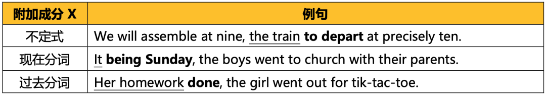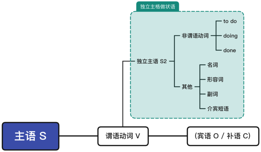 独立主格(nominative absolute),就是独立于主句之外的逻辑主语 + 附加成分做主句的状语,解释说明主句的原因、方式等,可以用公式表示为:独立主格 = S2 + X。附加成分可以是非谓语动词——因为「一个简单句有且仅有一个谓语动词」,也可以是名词、形容词、副词、介宾短语等成分。由其构成反推,在「V = be + V非 」成立的多数情况下,可以用如下方法验证独立主格:
