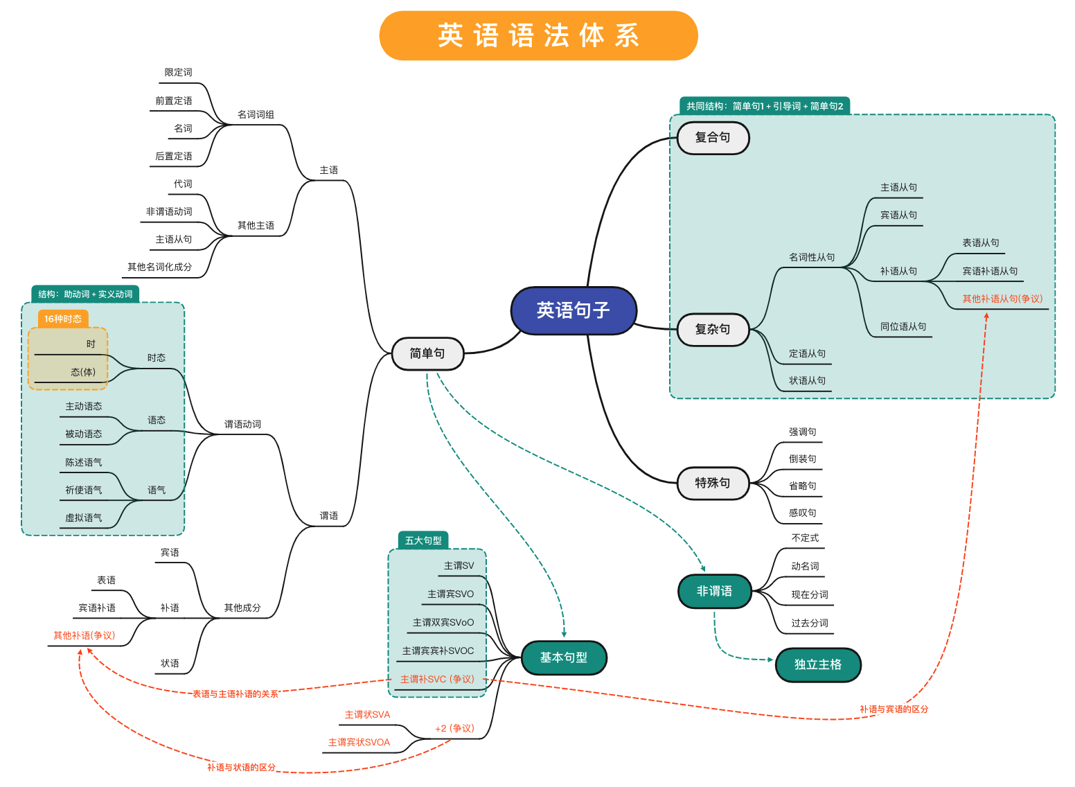 上述四点即本书前六章的内容,也是语法体系的核心。这些内容之间有着本质的有机联系,比如复杂句、复合句、非谓语动词本质都是为了表达复杂句意而又要避免出现多个谓语动词的方法。再结合第七章特殊句型的内容,可以画出整个英语语法体系的思维导图: