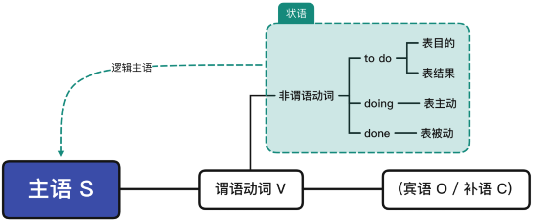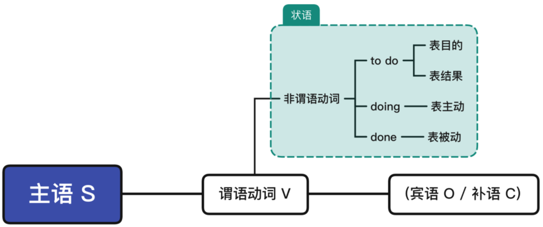 除动名词不能做状语外,不定式、现在分词和过去分词可以做状语。其中,不定式to do做状语一般是目的状语或结果状语(源自句型 S be to do sth. );现在分词doing做状语,与句子主语是主动的关系(源自进行时态 S be doing );过去分词done做状语,与句子主语是被动的关系(源自被动语态 S be done )。