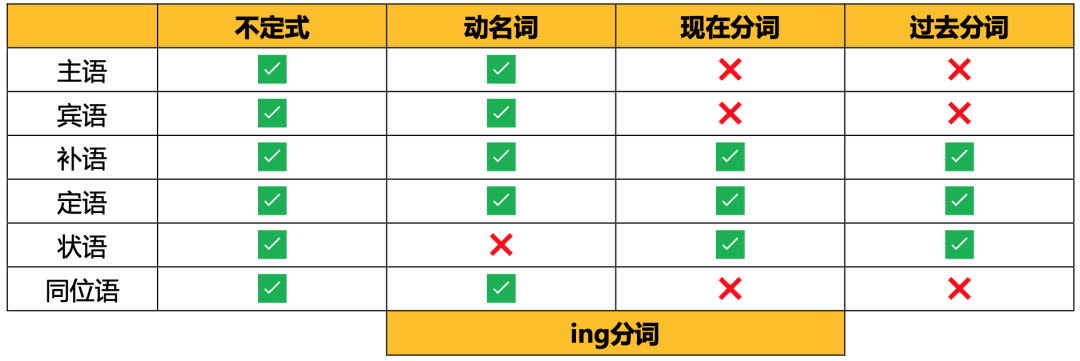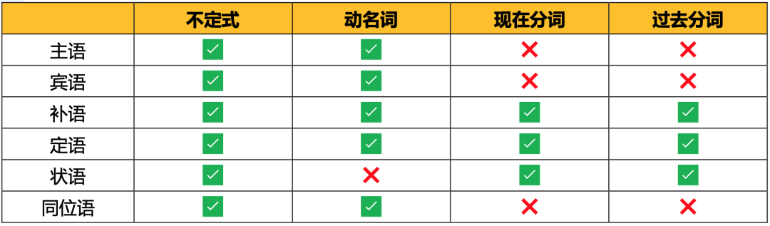 5?? 性质与功能。有一种几乎可以穷尽语法的方法,即遍历性质与功能,比如非谓语动词及更细致划分的不定式、动名词、现在分词、过去分词就是对某一类词/结构的定性,做主语、宾语、补语、同位语、定语、状语等语法成分就是这些非谓语动词所能胜任的语法功能。在语法学习中,不妨诘问这样的问题:名词能做哪些语法成分?能做状语的词/结构有哪些?本书以上标的形式标注性质与功能,比如 「To err」不定式-主语 is系动词-谓语动词 human形容词-表语。也用图表的形式直观地展现性质与功能,即将性质与功能分别列于表格的横轴与纵轴,比如非谓语动词的功能图如下( 1.1 非谓语动词)