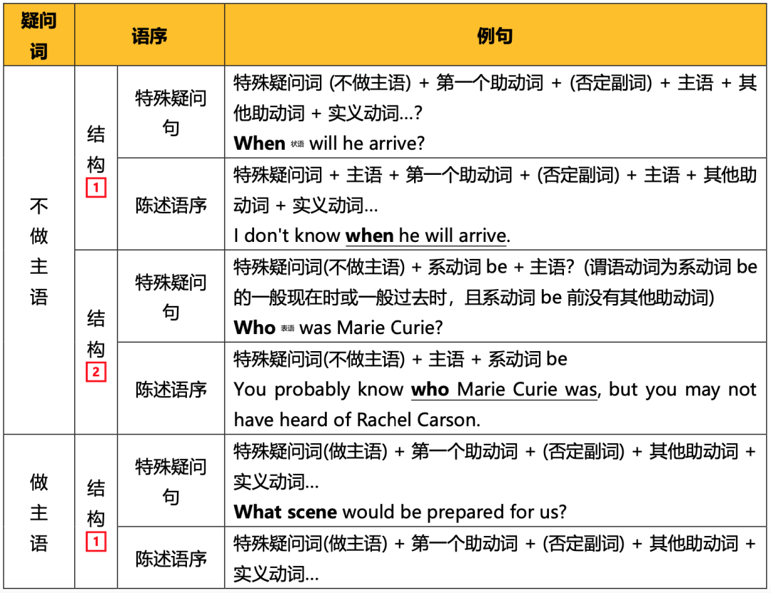 根据特殊疑问词是否做主语,特殊疑问句从结构上分为两类,分别对应两类「特殊疑问句的陈述语序」( 5.4.1 陈述语气