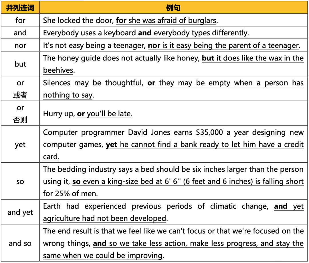 最简单的并列连词是fanboys(for、and、nor、but、or、yet、so的首字母缩写,还有and yet、and so两种组合形式)。其中or有「或者」和「否则」两种词义,nor后接的简单句2要用部分倒装( 7.2.2 部分倒装)。
