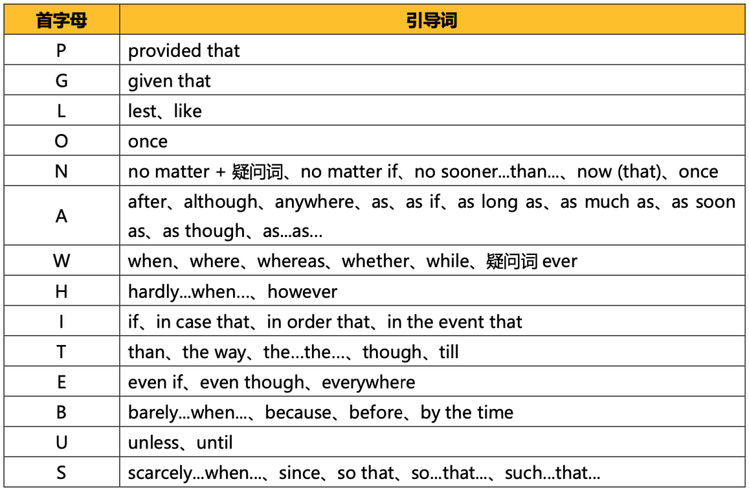 状语从句的引导词可以根据首字母总结为「PGL on a white bus」。