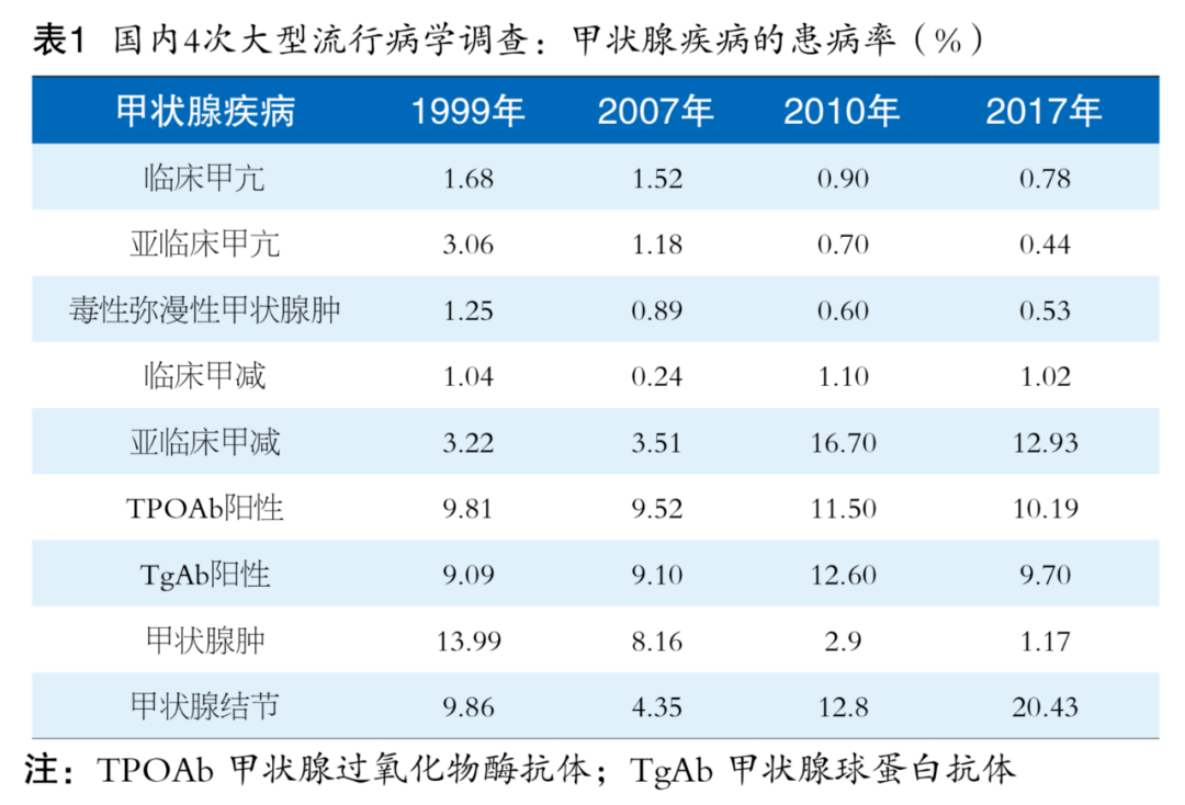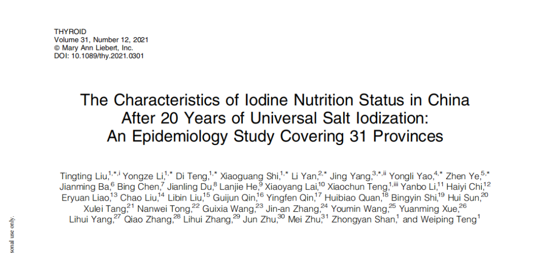 参考文献:[1] Li M, Eastman CJ. The changing epidemiology of iodine deficiency. Nat Rev Endocrinol. 2012 Apr 3;8(7):434-40. doi: 10.1038/nrendo.2012.43.[2] Taylor PN, Albrecht D, Scholz A, et al. Global epidemiology of hyperthyroidism and hypothyroidism. Nat Rev Endocrinol. 2018 May;14(5):301-316. doi: 10.1038/nrendo.2018.18.[3] 滕卫平.坚持食盐加碘 保护甲状腺健康.中华医学信息导报,2020,35(19):18-18.[4] Liu T, Li Y, Teng D, et al. The Characteristics of Iodine Nutrition Status in China After 20 Years of Universal Salt Iodization: An Epidemiology Study Covering 31 Provinces. Thyroid. 2021 Dec;31(12):1858-1867. doi: 10.1089/thy.2021.0301.[5] Li Y, Teng D, Ba J, et al. Efficacy and Safety of Long-Term Universal Salt Iodization on Thyroid Disorders: Epidemiological Evidence from 31 Provinces of . Thyroid. 2020 Apr;30(4):568-579. doi: 10.1089/thy.2019.0067.[6] Teng D, Yang W, Shi X, et al. An Inverse Relationship Between Iodine Intake and Thyroid Antibodies: A National Cross-Sectional Survey in . Thyroid. 2020 Nov;30(11):1656-1665. doi: 10.1089/thy.2020.0037.本文首发丨医学界内分泌频道本文作者丨鲸鱼本文审核丨中国医科大学附属第一医院内分泌科主任单忠艳责任编辑丨曹前版权声明本文原创,转载请联系授权-End-投稿/转载/商务合作,请联系:pengsanmei@yxj.org.cn