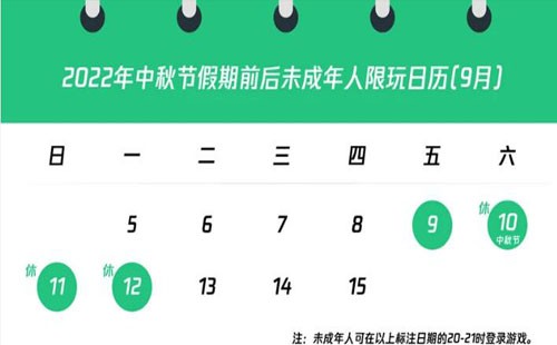 9.10-12日是中秋节,未成年人可以在9.9-9.12这两天的晚上20-21时登录游戏。想要刷分的朋友们,注意一下时间,这段时间可能会遇到不少学生。