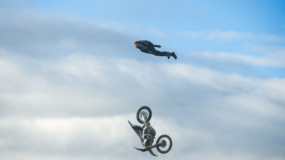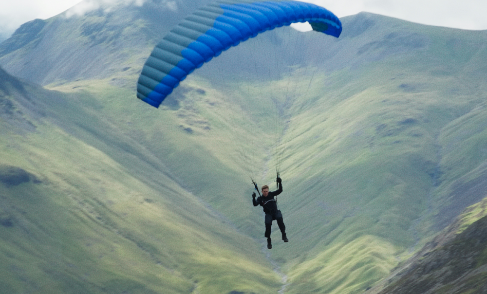 电影时长164分钟,动作戏占比极重,但我有点不满的是电影宣传噱头最大的飞车跳崖,这段戏是阿汤哥必须开着机车追上火车,没想到反派不讲武德,在拐弯处加速了,导致计划有变,阿汤哥只能抄近路,也就是越过悬崖通过伞降达到火车。