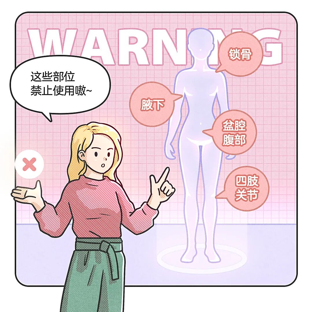 使用时顺着肌肉的走向,从低频率开始尝试,根据肌肉的厚度、自己对震动的需求选择频率档位,每个区域的肌肉一般按摩 1~2 分钟即可。