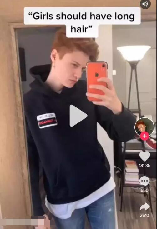 上图为国际版抖音APP(即Tik Tok)用户使用“OK Boomer”作为标签上传的短视频内容。视频中的标题为:“女孩子就应该留长头发。”而视频中的女孩拍摄自己短发的样子,并以此作为对这种刻板印象的回应。? sybil.kappert / Tik Tok