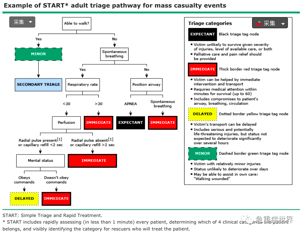 现场分流通常使用三个类别来确定优先接受现场治疗和运输:“立即”患者首先接受治疗和运输,其次是“延迟”类别。“未成年人”类别患者可能在现场接受治疗和释放或最后运送。“预期”类别通常用于生存可能性较低的患者,例如心脏骤停患者、严重头部损伤、持续休克患者和大面积烧伤患者;这些患者可能会接受姑息治疗(图 1)。在许多事件中,一些被归类为“预期”的患者最终存活了下来,因此所有病例都需要重新分诊。