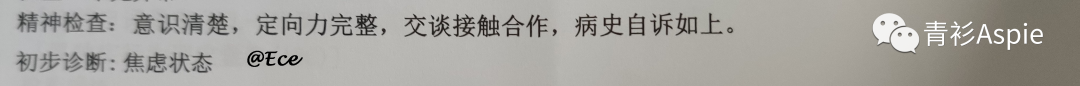 携带物品建议:保证舒适的物品: 降噪耳机;小板凳或坐垫对诊疗有帮助的物品:在其他精神类门诊开具的病例;目前正在吃的药物清单或做过的大型手术清单;身份证(用于现场办理京医通卡);录音设备如手机或同伴(可能当场宕机或没法立即记录医生口头信息的情况);如果担心自己无法完整陈述自己的情况或回答医生的问题,也可以携带提前写好的文稿或发育史总结,但个人不太推荐这么做;或者请您一定要把文稿写的条理一些并适当注意里面的感性情绪化内容比例,具体原因请看第5部分。我的就诊流程:当天早上八点半左右到达医院,人比较多。二楼专家号分诊台分诊后到专家科室走廊里,等了约半小时;同时根据走廊诊室标牌知道我的医生是何凡。注意:虽然二楼候诊大厅里面有很多座位,但如果挂的号比较早,分诊后护士可能会直接要求就诊者到没有座位且人多的狭窄走廊里等待。如果担心体力不支可以带个小板凳或坐垫,我当时是直接坐在地上。我的父母不在北京且态度不是特别配合,没有和我一起就诊。但我带了和我共同生活四年左右的伴侣。叫到号时我单独一人进诊室,伴侣留在门外等待。我因为已经酝酿了很久就诊时要说的话,所以没等医生询问就主动说到自己找咨询师以及被咨询师推荐来就诊的事情。接下来医生问我为什么要去找咨询师,小时候有无异常等等一系列发育史问题,主要围绕社交和人际关系。最后还问我对眼神接触的态度以及是否从小出现这一问题(因为我属于极其回避眼神接触的类型,非常明显)。整个流程基本是一问一答,医生问什么我说什么,偶尔我补充一点突然想到的信息。最后我们就其中一些未尽细节进行了讨论,医生对发育障碍可能表现肯定态度,但初诊未给明确的确诊词汇。开病历及检查单子,要求检查完再来复诊。初诊病历 作者供图(医生是有选择性的记录病历内容,其他很多说到的地方没有写进病历,拿到这一病历一度引起我的焦虑。但与医生交流过程中感觉她观念无问题,而且虽然初诊病历未提到阿斯伯格相关内容,医生却在交流过程中肯定我属于神经多样性发育,提到可能因为语言发育早有非语言互动缺损的问题,以及认为我吃之前精神科开的抗抑郁药物胃肠道副作用很大是因为“我这类人”胃肠道对药物相对敏感,实际上在暗示对我ASD可能的认可。好在最后能够拿到诊断结果。)