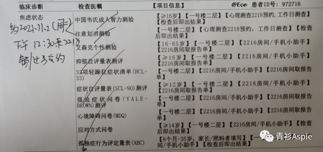 3.检查需要携带的物品:检查单;降噪耳机。检查项目:① 中国韦氏成人智力测验(2218,和②一起做,先做完①不休息马上做②)② 注意划消测验(2218,和①一起做,先做完①不休息马上做②)③ 艾森克个性测验(2216或2216门口扫码手机上完成,下同)④ 33项轻躁狂症状清单(HCL-33)(2216)⑤ 心境障碍问卷(MDQ)(2216)⑥ 强迫症状问卷(YALE-BROWN)测评(2216)⑦ 应对方式问卷(2216)⑧ 症状自评量表(SCL-90)测评(2216)⑨ 孤独症行为评定量表(ABC)(2216)9项共计471元。(不同医生开具的检查项目可能不同,像这篇微博文章《北京安定医院确诊阿斯伯格综合征》的作者检查项目几乎是我的两倍)