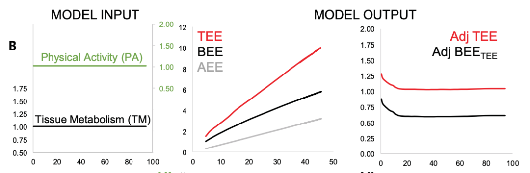 观察到的总能量消耗(TEE;红色)、基础能量消耗(BEE;黑色)和活动能量消耗(AEE;灰色),与年龄、去脂体重相关。图片来源:参考资料[1]