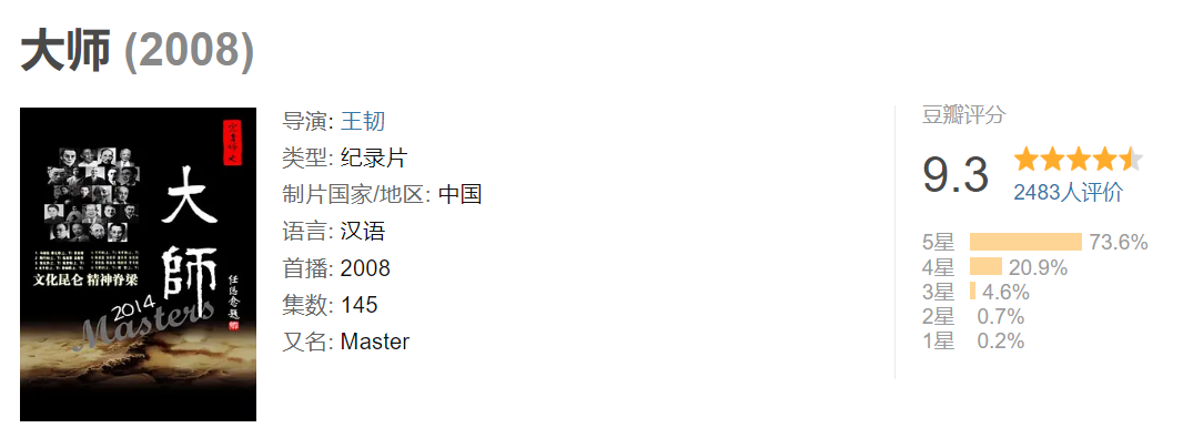 百集文化系列片《大师》是上海文广传媒集团纪实频道以栏目形式打造的一个电视文化工程,是今人重读中国近现代史的一个构想,是我们与观众共同走近“大师”、感受伟大的一种尝试,是用敬畏和自信来打造艺术精品的一种努力。