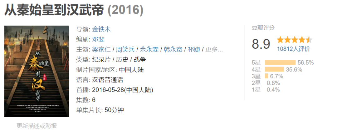 纪录片《从秦始皇到汉武帝》以最新的考古研究成果为切入点,以展现中华文明青春期最优秀的气质为目的,将汇聚电视、电影、以及历史文献的各种亮点元素、艺术手法,体现上造影视“用电影思维,打造高端纪录片”的宗旨,是一部受众群体广泛的历史纪录片。
