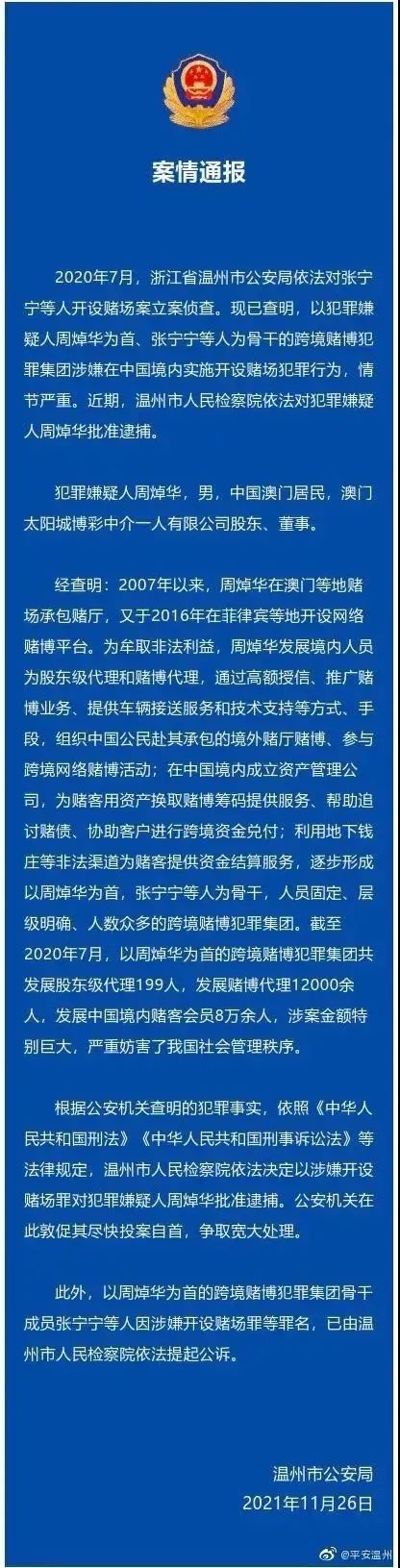 2021年11月26日晚上9点,平安温州突然发出一纸案情通报,以涉嫌在中国境内实施开设赌场犯罪行为,正式批捕周焯华。