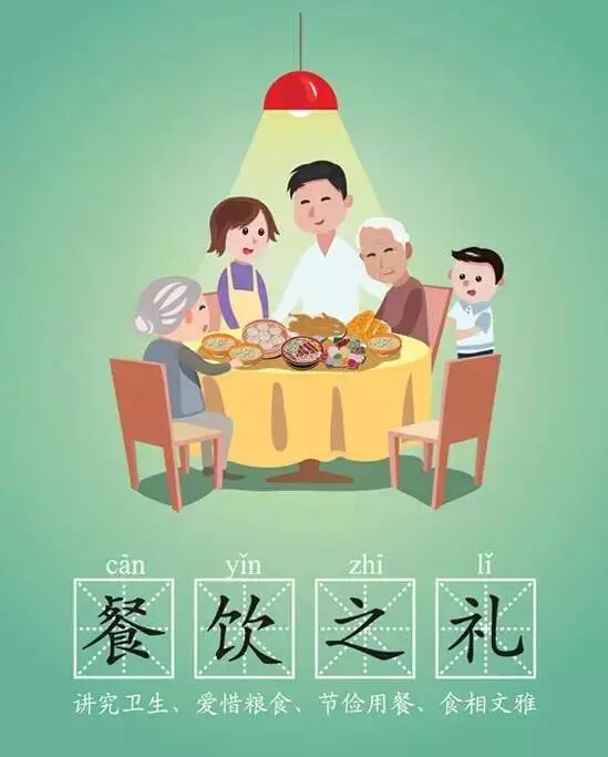 讲究卫生、爱惜粮食、节俭用餐、食相文雅。