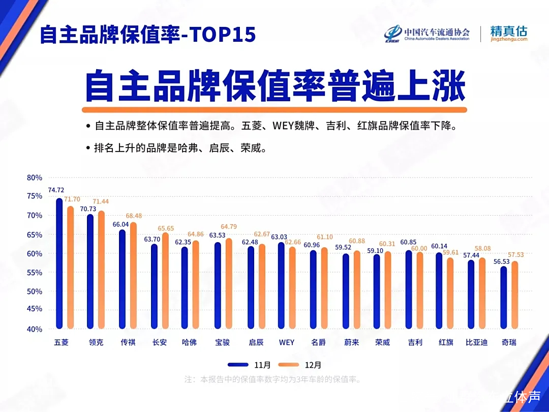 五菱依然是自主品牌中保值率最高的品牌,12月保值率71.7%;另一个保值率超过70%的是领克,12月保值率71.44%。传祺的12月保值率为68.48%,相比11月的66.04%提升明显。长安、哈弗、宝骏的保值率都在65%左右,分别为65.65%、64.86%、64.79%。启辰和WEY分别为62.67%、62.66%。名爵、蔚来、荣威、吉利都达到或超过60%,分别为61.1%、60.88%、60.31%和60%。红旗、比亚迪、奇瑞分别为59.61%、58.08%、57.53%;还要继续努力。