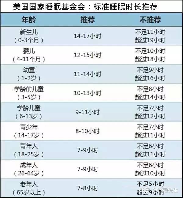 2015年,一个由睡眠科学、解剖学、生理学、儿科学、神经学、老年学和妇科学组成的专家小组联合起来,共同制定了新的、针对不同年龄的睡眠时长建议,并由美国国家睡眠基金会发布。