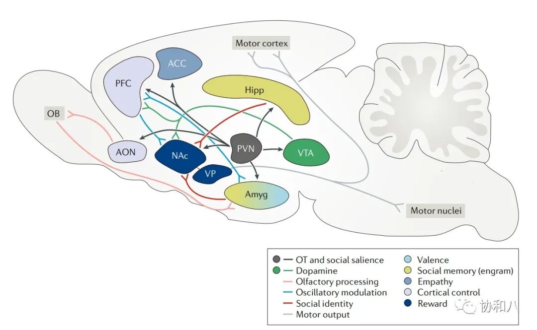 在啮齿动物中,AON表达高水平的OT受体(OXTR),在PVN中接受OT神经元的投射,而阻断AON中的OXTR会损害小鼠的社会性认知,证明OT信号的交接对于小鼠的社会交往而言是关键因素。有趣的是,雌性草原田鼠AON中OXTR的表达受到雌二醇的调控,当未交配的雌性草原田鼠暴露于雄性信号后,雌二醇和OXTR表达均增加,这小小的改变可能就此开启了它们一生的浪漫故事。