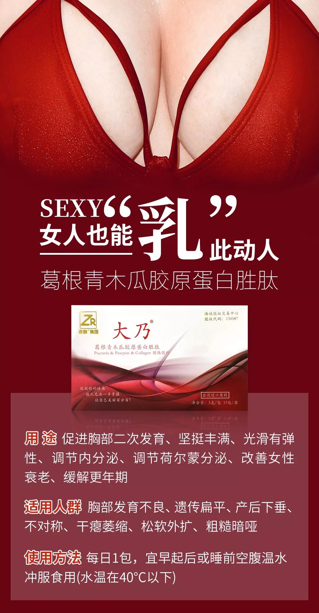 政融大乃葛根青木瓜胶原蛋白胜肽经严格的临床验证能够有效的促进胸部二次发育、坚挺丰满、光滑有弹性、调节内分泌、调节荷尔蒙分泌、改善女性衰老、缓解更年期。