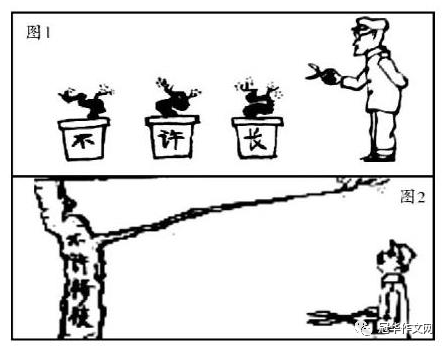 [注]图1花盆上的文字为“不许长”;图2树杆上的文字为“不许修枝”。