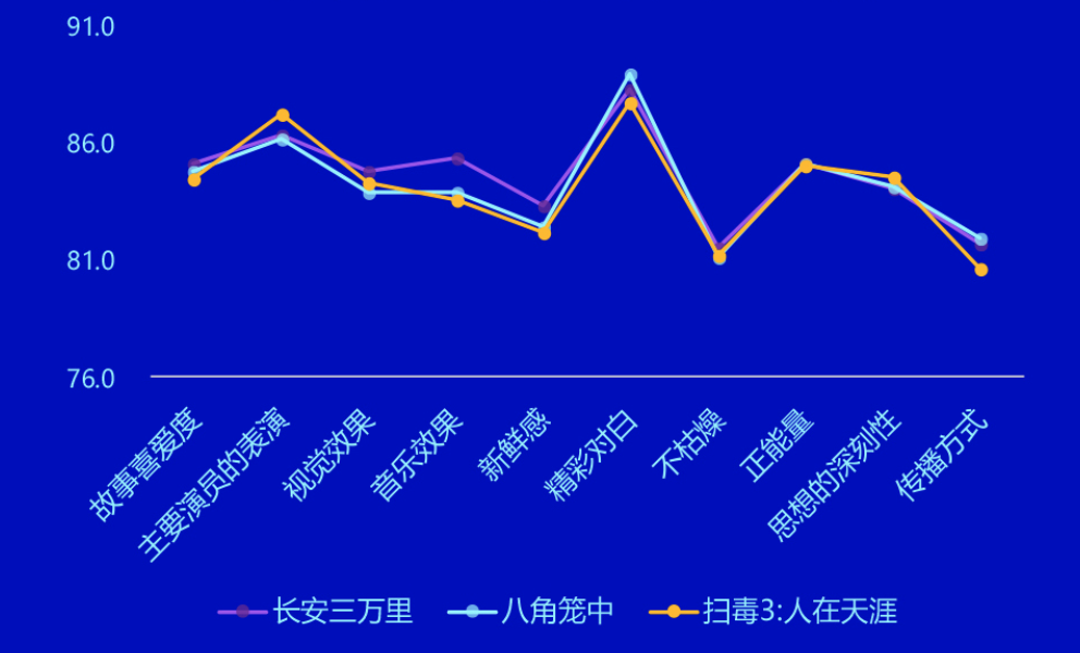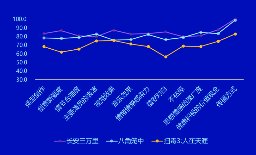 在普通观众评价中,《长安三万里》的音乐效果、正能量、故事喜爱度、视觉效果、新鲜感和不枯燥指标得分均最高,《八角笼中》的精彩对白、传播方式得分最高,《扫毒3:人在天涯》的主要演员的表演、思想的深刻性得分最高。