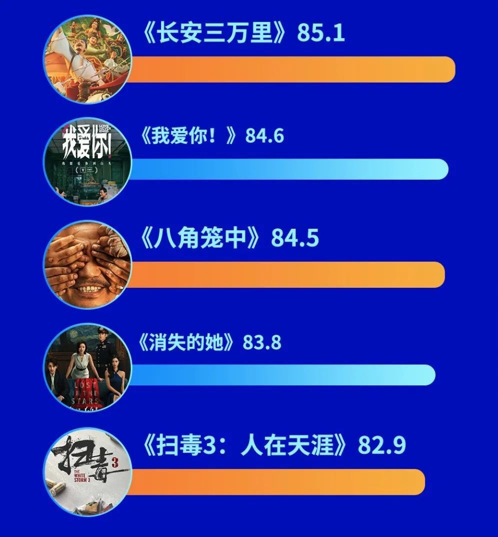 7月上旬三部新片中,《长安三万里》满意度85.1分,为追光动画出品系列动画电影最高分;《八角笼中》满意度84.5分,比王宝强导演上一部作品《大闹天竺》高出4.9分;港片IP续作《扫毒3:人在天涯》满意度得分82.9分。