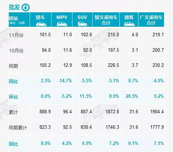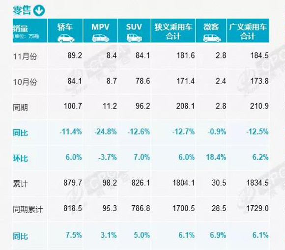 在乘用车零售销量方面,11月份轿车市场零售销量为89.2万辆,同比下降11.4%,环比增长6.0%;MPV市场零售销量8.4万辆,同比下跌24.8%,环比下降3.7%,销售不理想;SUV市场零售销量84.1万辆,同比减少12.6%,环比增长7.0%。