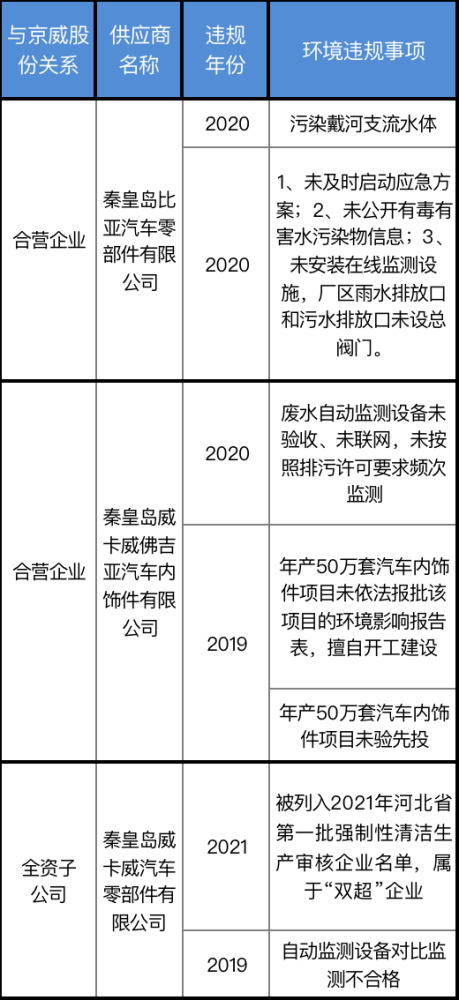 经检索蔚蓝地图数据库,京威股份的另一家合营企业——秦皇岛威卡威佛吉亚汽车内饰件有限公司,也于2020年12月因废水在线监测设备未验收联网、每季度未按照要求进行比对监测、未对废水总排口排放的COD、氨氮、总磷进行手工监测等多项违规,被秦皇岛市生态环境局处以行政处罚(秦环罚〔2020〕0041号)[13]。